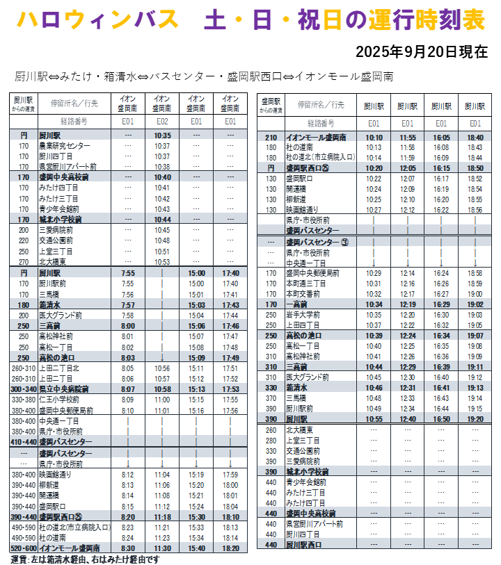 ※急な車両変更などで上記のダイヤで運行できない場合がございます。あらかじめご了承ください。