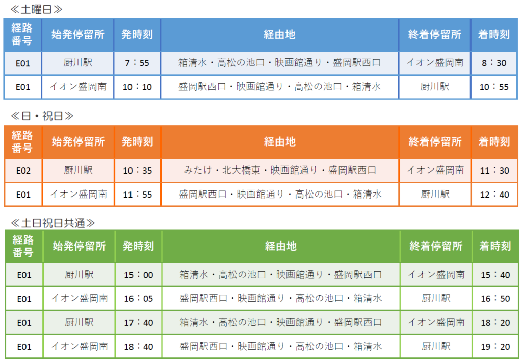 平日は日々異なるダイヤで運行いたしますが、土・日・祝日は下記のダイヤで運行いたしますので、お出かけの際などにぜひご乗車ください。