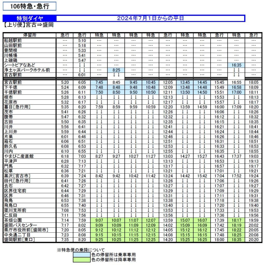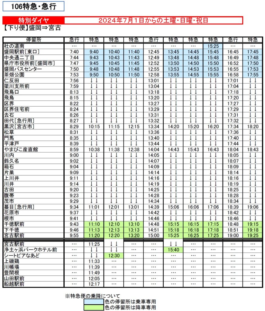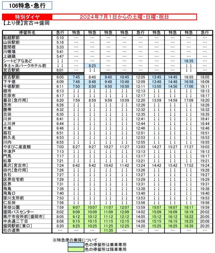 ●「106特急」は「盛岡駅前~茶畑公園」間および「宮古駅前~千徳駅前」間のみのご利用はできません。