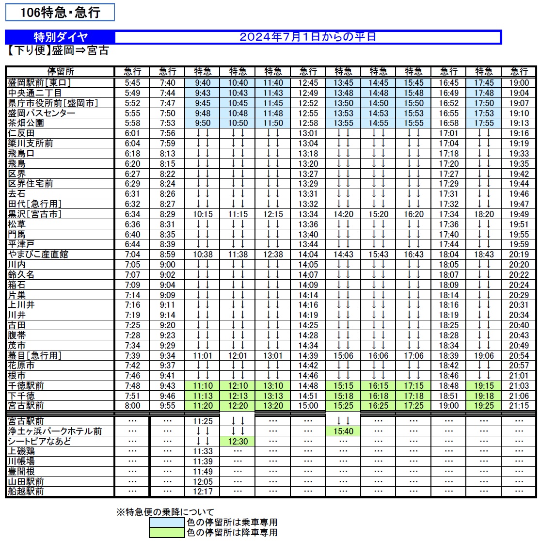 ●「106特急」は「盛岡駅前~茶畑公園」間および「宮古駅前~千徳駅前」間のみのご利用はできません。