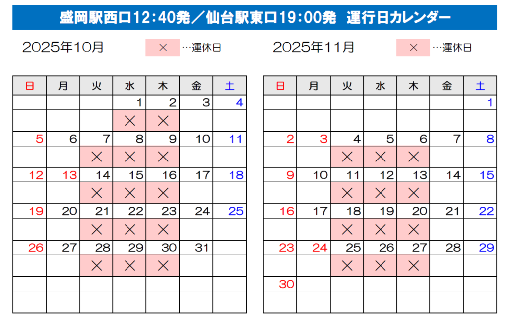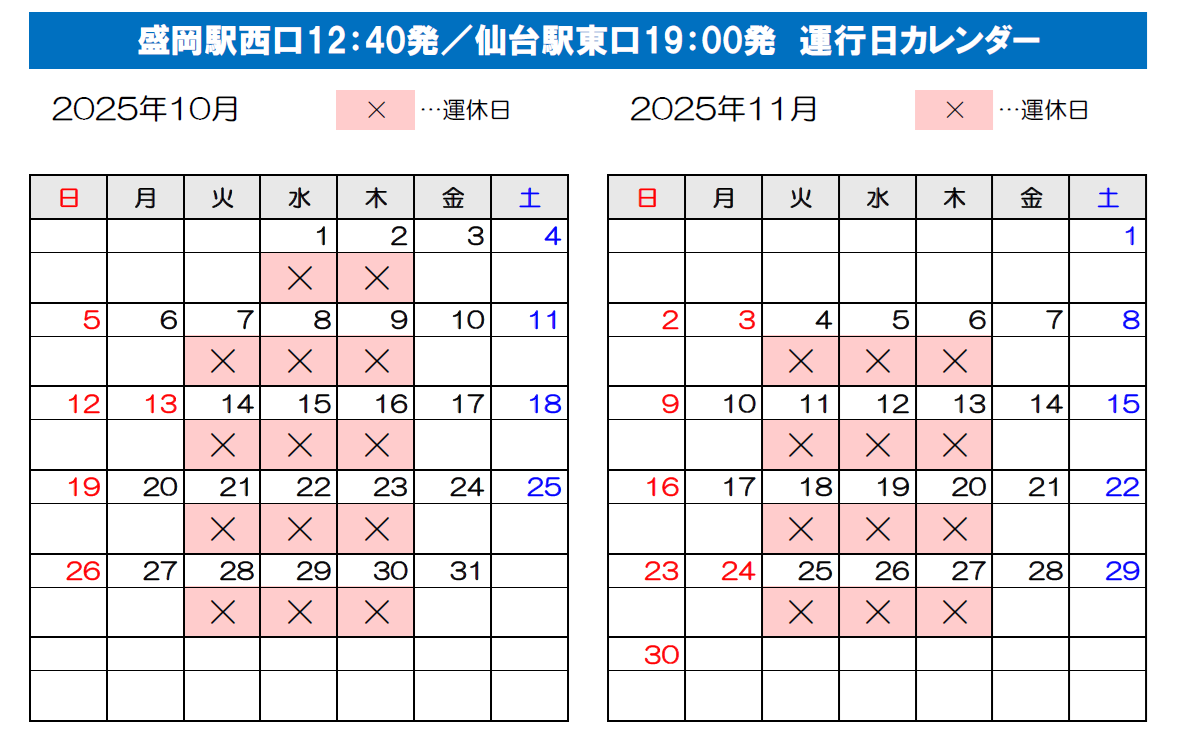 ※2024年4月1日より当面の間、仙台発 10:00発 / 盛岡発17:25発の便は、金土日祝日のみ運行しております。