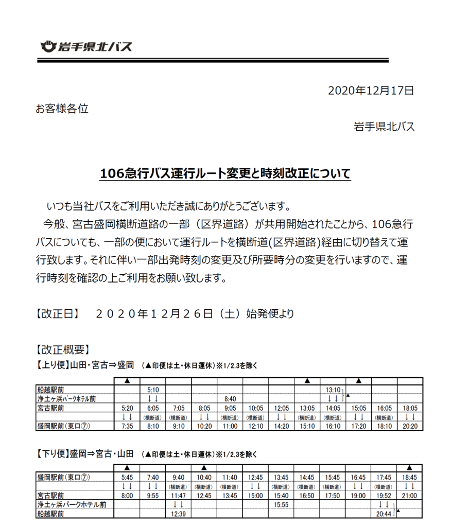 【宮古~盛岡間急行バス(106急行)】運行ルート変更と時刻改正のお知らせ(2020.12/26~2021.3/31)