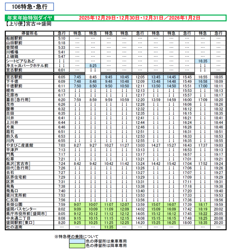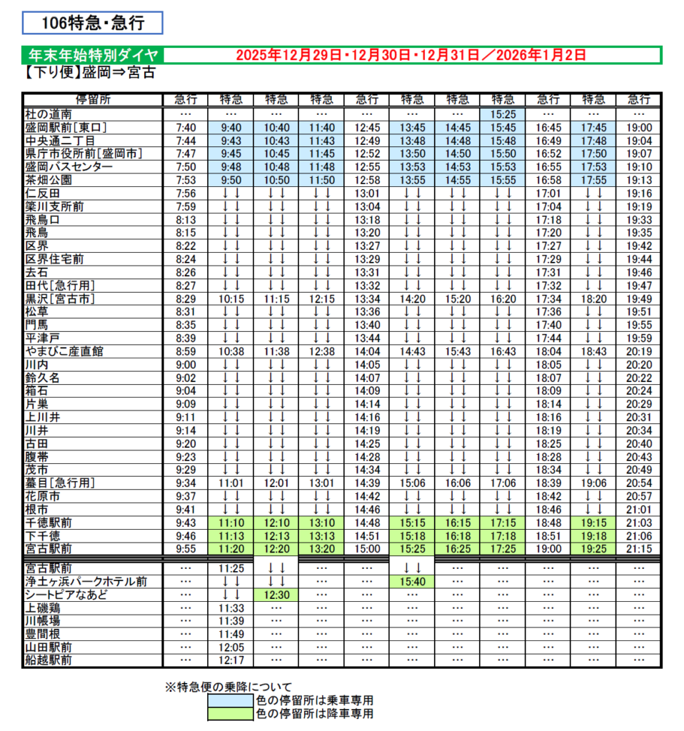 【盛岡~宮古線(106特急・急行バス)】年末年始期間の特別ダイヤについて(2025.12/27~2026.1/4)
