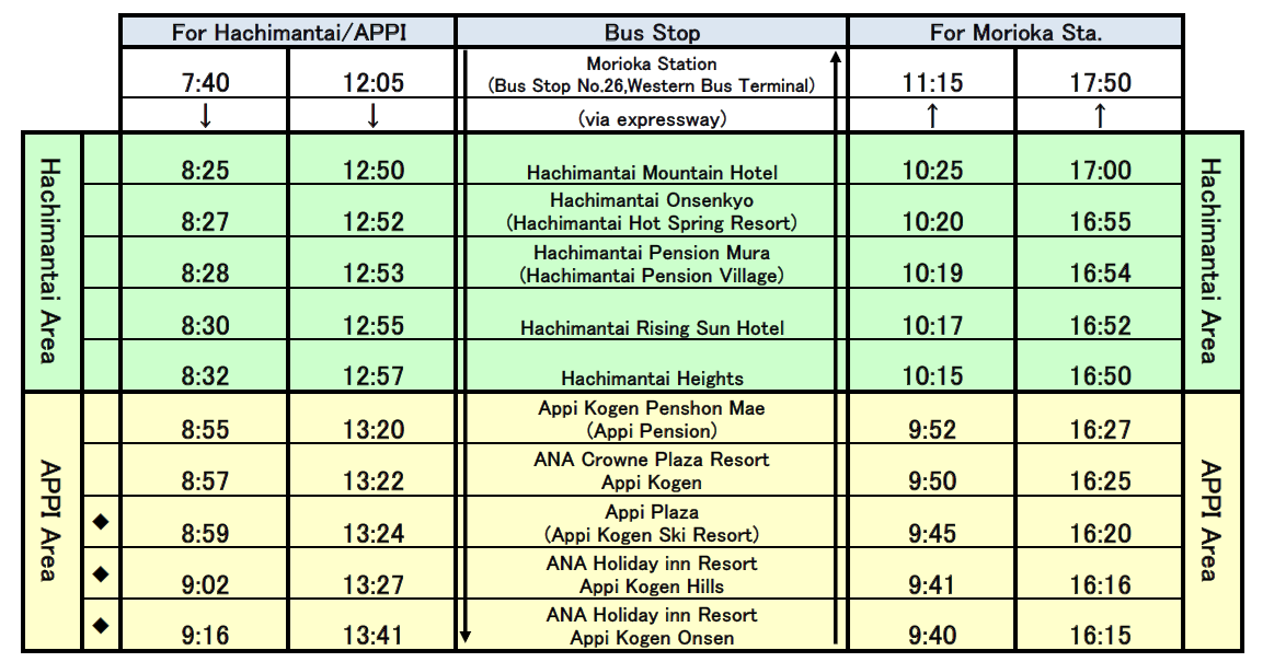 ◆This is a direct bus service between Morioka Station and Hachimantai/Appi via expressway only during winter season.
