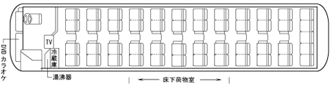 テレビ(中間テレビなし)/DVD/HDDカラオケシステム(一部車両)/冷蔵庫・湯沸器/読書灯/フルオートエアコン/大型トランクルーム3個/フリーWi-Fi/コンセント(一部車両)/抗菌シートコーティング/排ガス規制適合車/プラズマクラスター・イオン発生装置(一部車両)