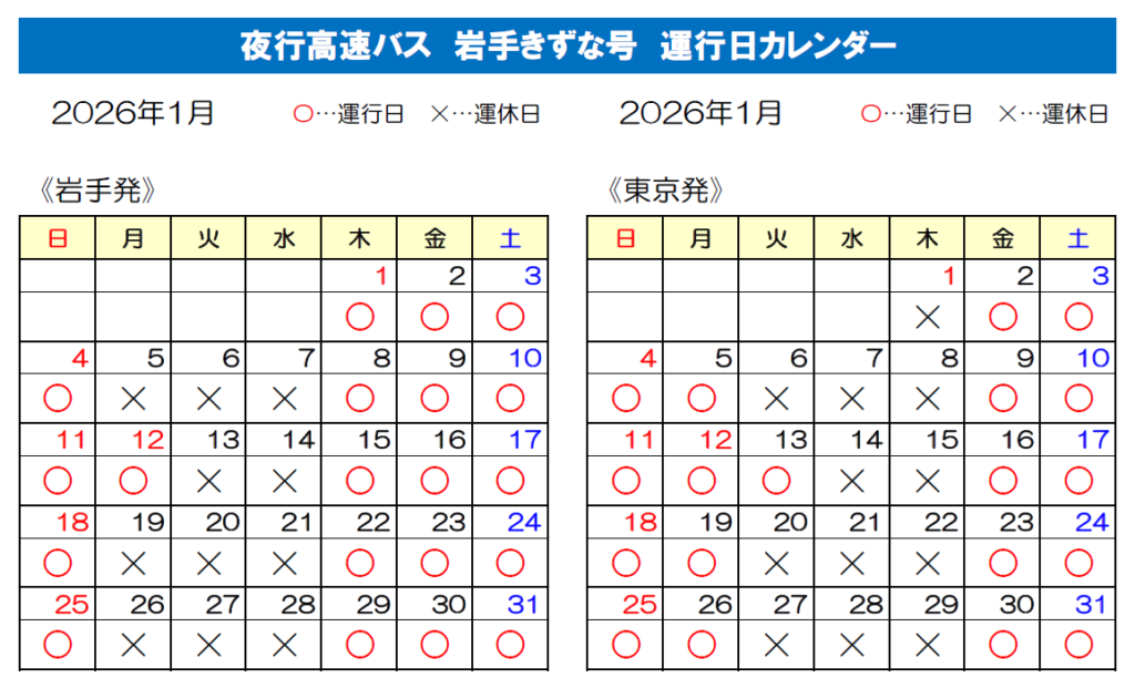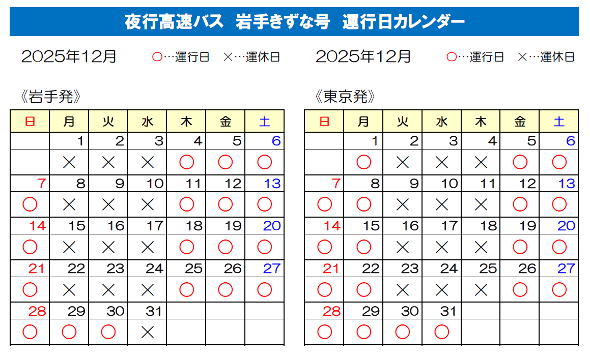 ◆12月・1月の運行日は下記のカレンダーをご参照ください。