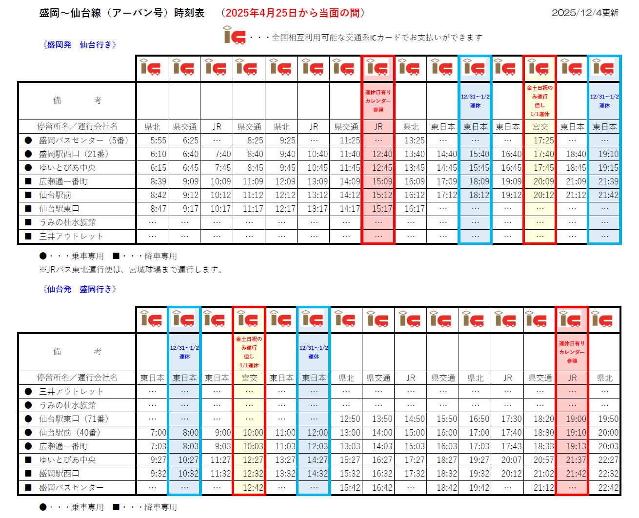 (2)「盛岡南営業所5:25発 盛岡駅前行き」は、土日祝に加えて12/27~1/4も運休いたします。