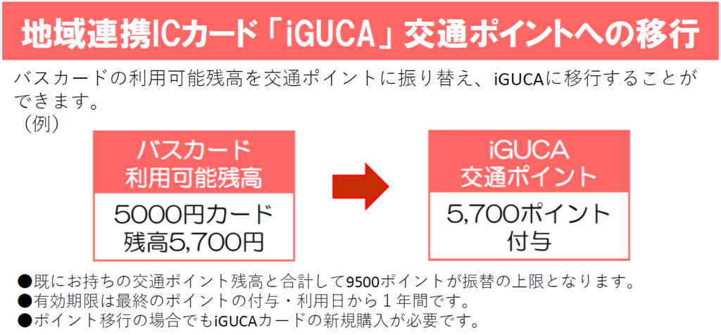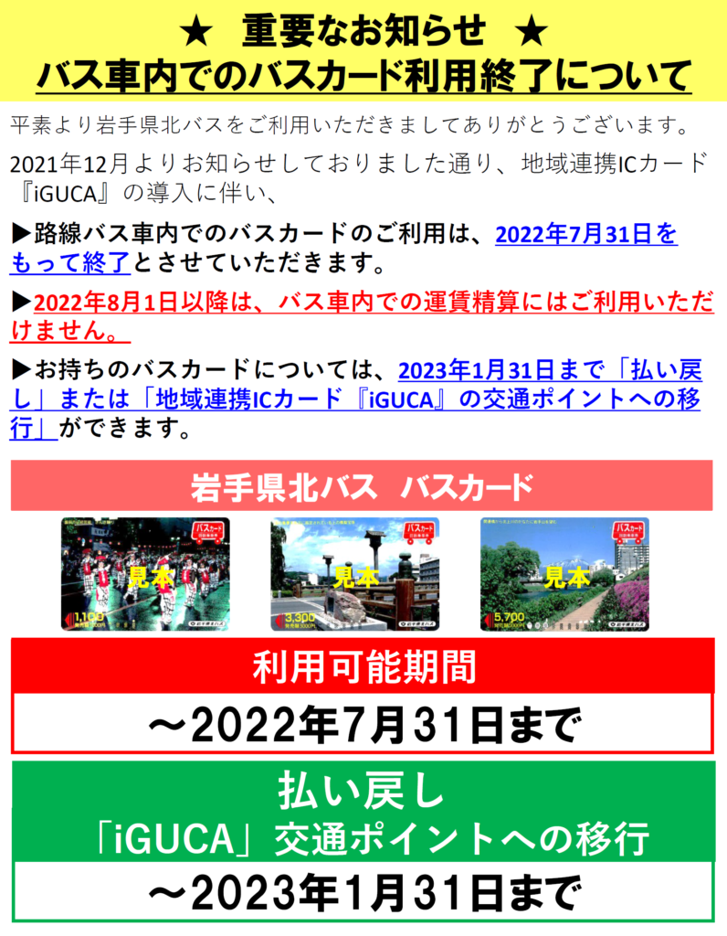 以前からご案内しておりました通り、バスカードの「払い戻し」・「『iGUCA』交通ポイントへの移行」の受付は、2023年1月31日(火)をもって終了とさせていただきます。