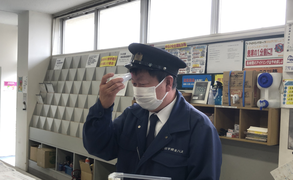 出勤時に必ず体温並びに健康状態を確認します。健康上支障のおそれのある場合は乗務を見合わせます。