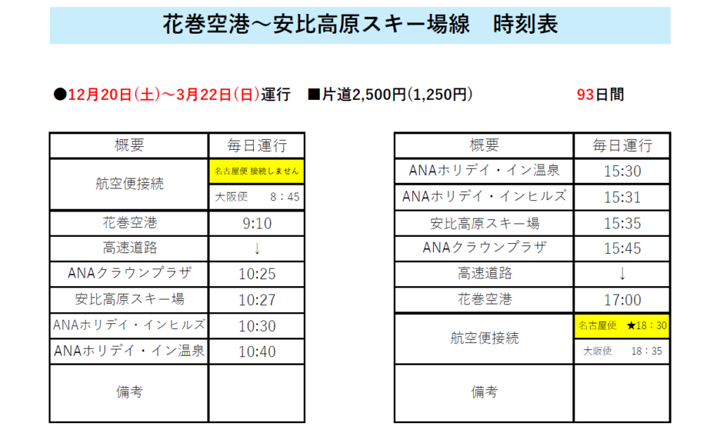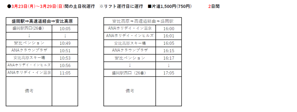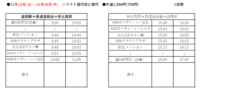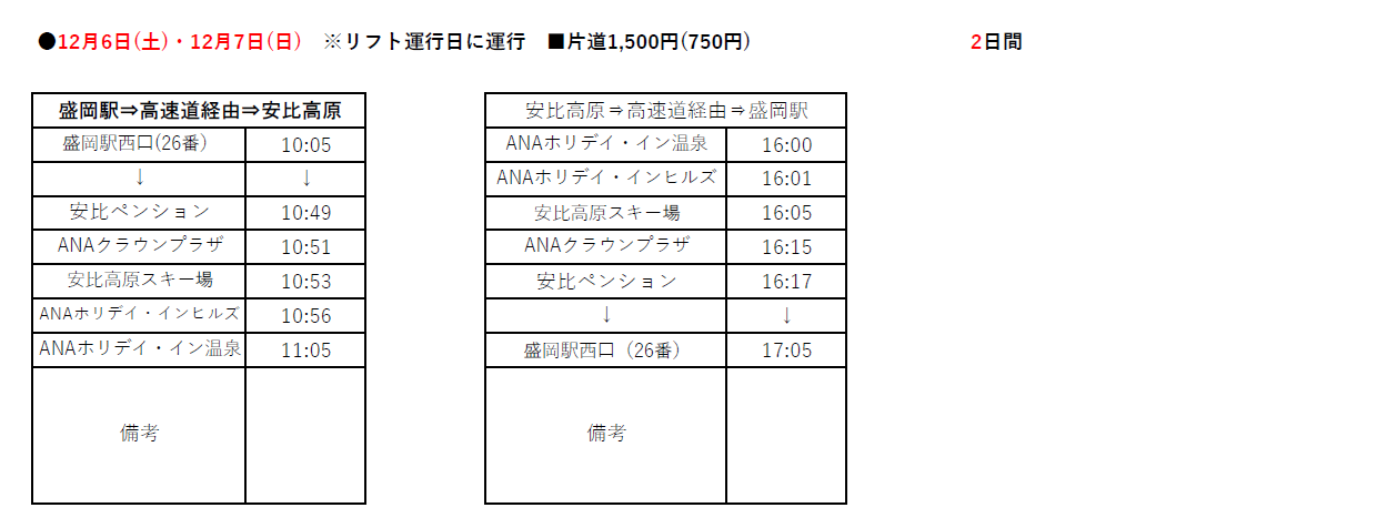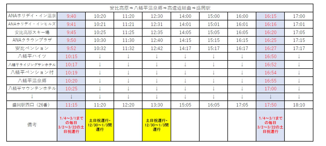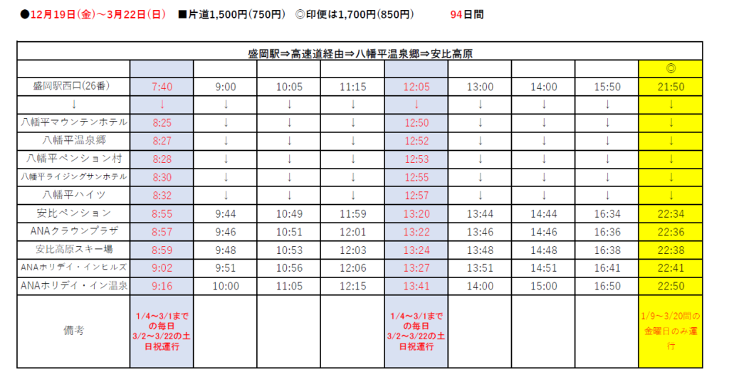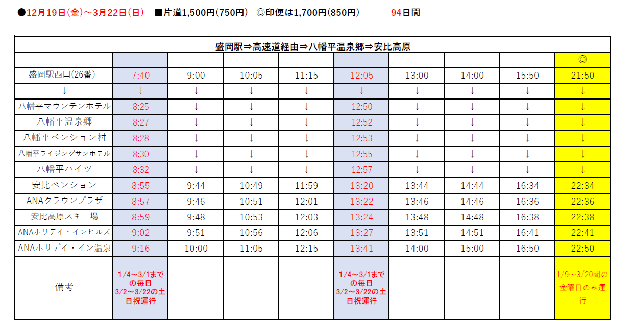 2025-2026 Winter Season 安比高原スキー場線の運行予定時刻のお知らせ