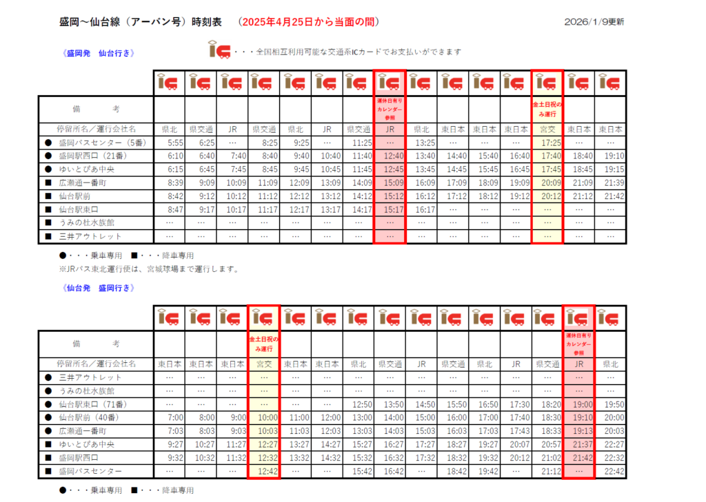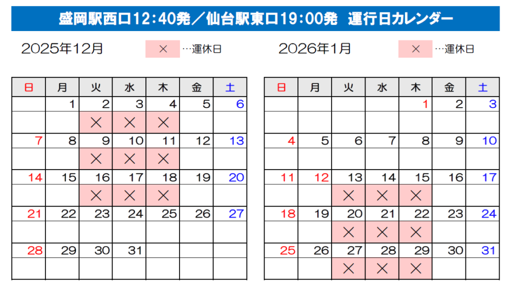 ※2024年4月1日より当面の間、仙台発 10:00発 / 盛岡発17:25発の便は、金土日祝日のみ運行しております。