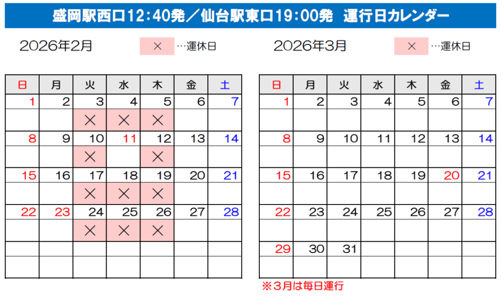 ※2024年4月1日より当面の間、仙台発 10:00発 / 盛岡発17:25発の便は、金土日祝日のみ運行しております。