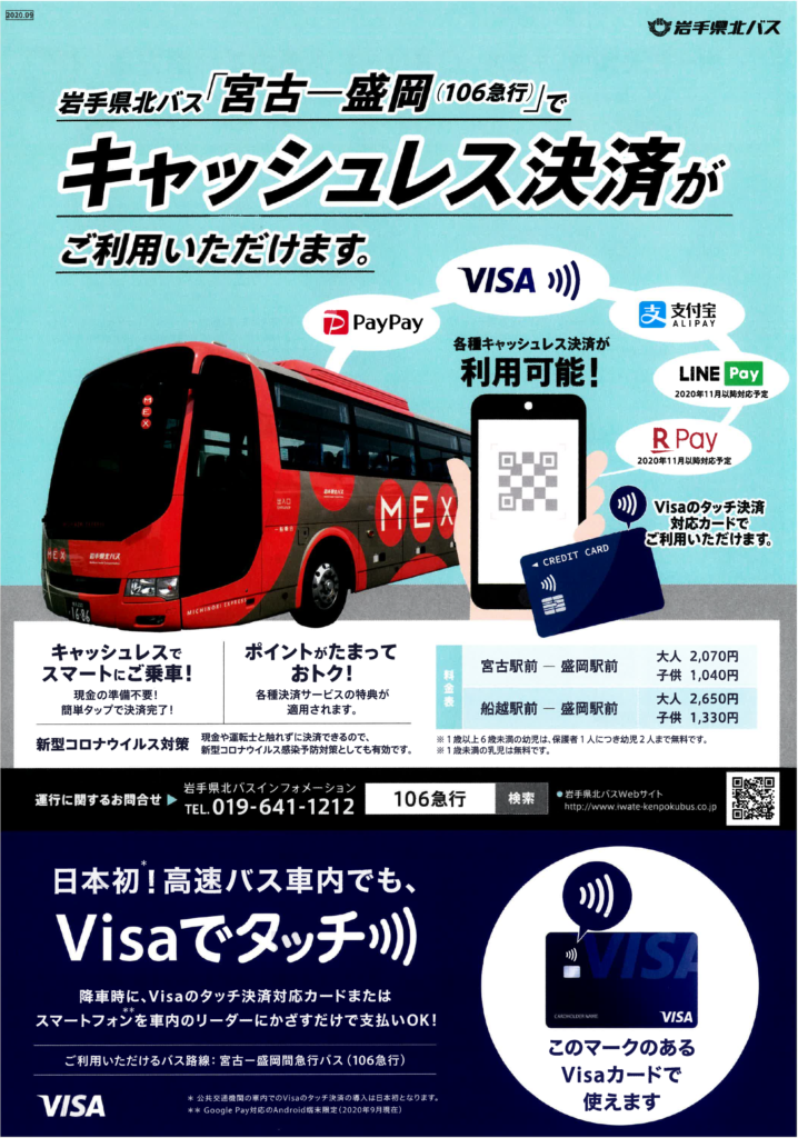 2020年9月28日より開始した【宮古~盛岡間急行バス(106急行)】車内でのキャッシュレス決済において、新たに「LINE Pay」と「楽天Pay」がご利用いただけるようになりましたのでどうぞご利用ください。