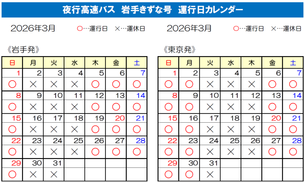 ◆1月・2月・3月の運行日は下記のカレンダーをご参照ください。