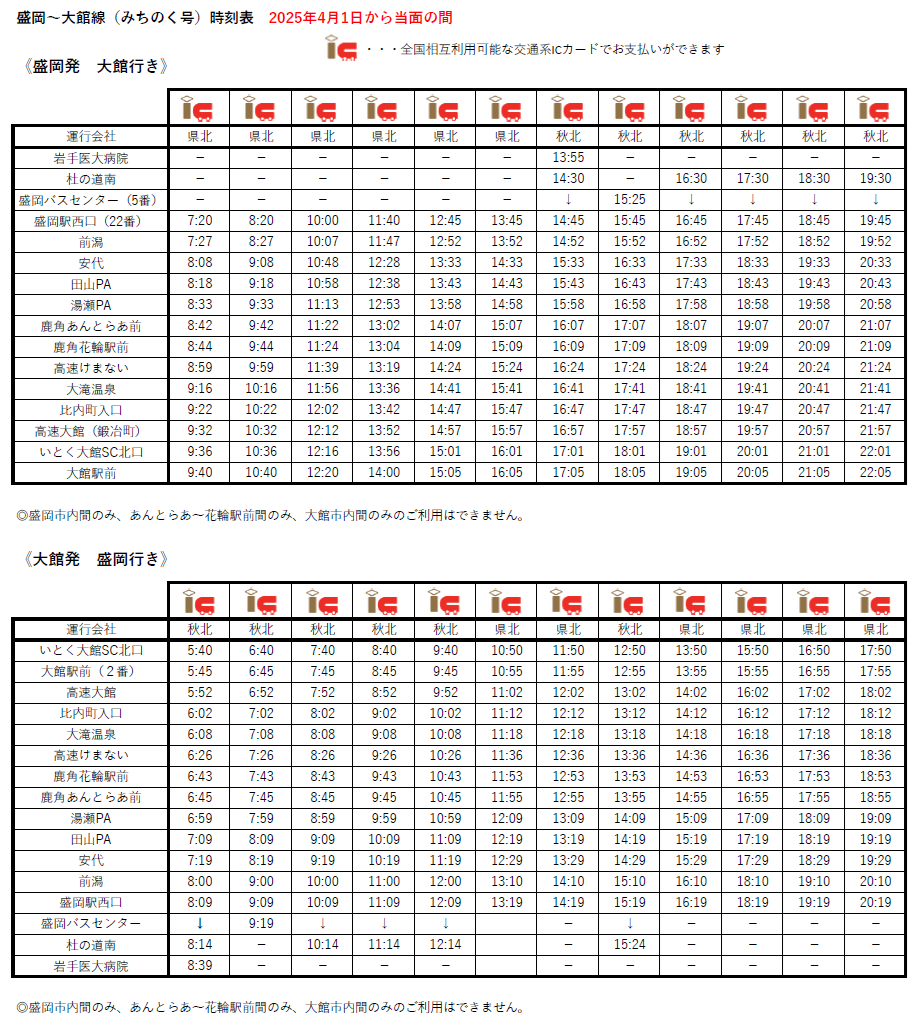 ※引き続き、盛岡駅西口10:40発大館ゆきと、いとく大館ショッピングセンター北口14:50発盛岡ゆきは、当面繁忙期のみ運行する予定です。