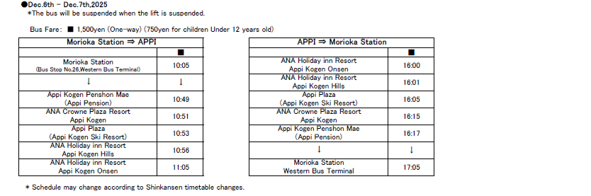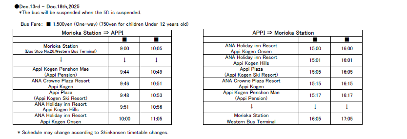 Iwate Kenpoku Bus will operate a bus service between various locations and the APPI area in time for the ski season!