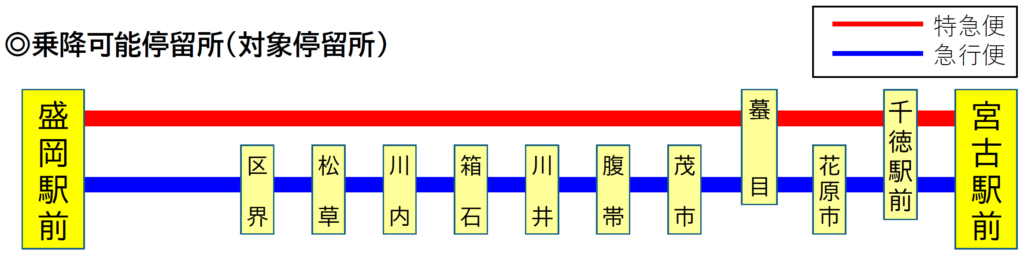 ・乗降可能な停留所は、盛岡駅前、蟇目、千徳駅前(下り;降車のみ)、宮古駅前です。